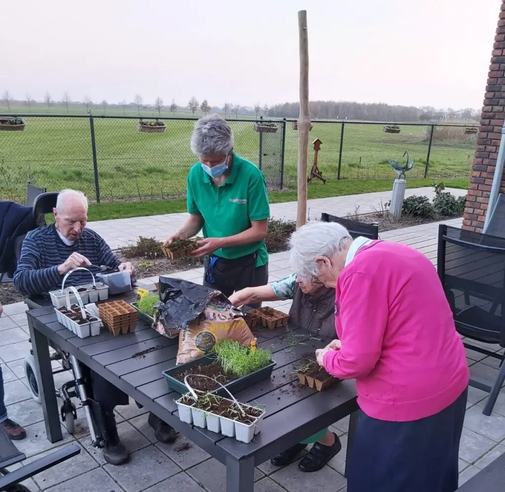 Dagelijks leven staat voor zorg als thuis. Dat heb ik wel in de vingers. Ik geniet ervan om juist die ‘thuisgevoel’-momenten in mijn werk op te zoeken. Even samen zitten om een stuk fruit klaar maken. Samen plantjes zaaien, verpotten en het groeiproces volgen. Of even één op één een praatje maken als iemand daar behoefte aan heeft. Ook humor vind ik erg belangrijk. Samen lachen verbindt, zorgt voor contact, kan ontlading geven. Van sommige situaties kun je zelfs wekenlang lol hebben, ook in de dementiezorg!