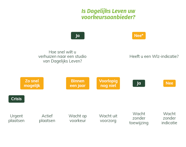De wachtlijst kent verschillende wachtstatussen. De wachtstatus zegt iets over hoe dringend de zorgvraag is en hoe snel de toekomstige bewoner zou willen verhuizen naar de locatie van Dagelijks Leven. Het is dus niet zo, dat degene die zich als eerst heeft ingeschreven ook altijd als eerst aan de beurt is om te verhuizen naar een studio. Maar hoe werkt de wachtlijst dan wel?